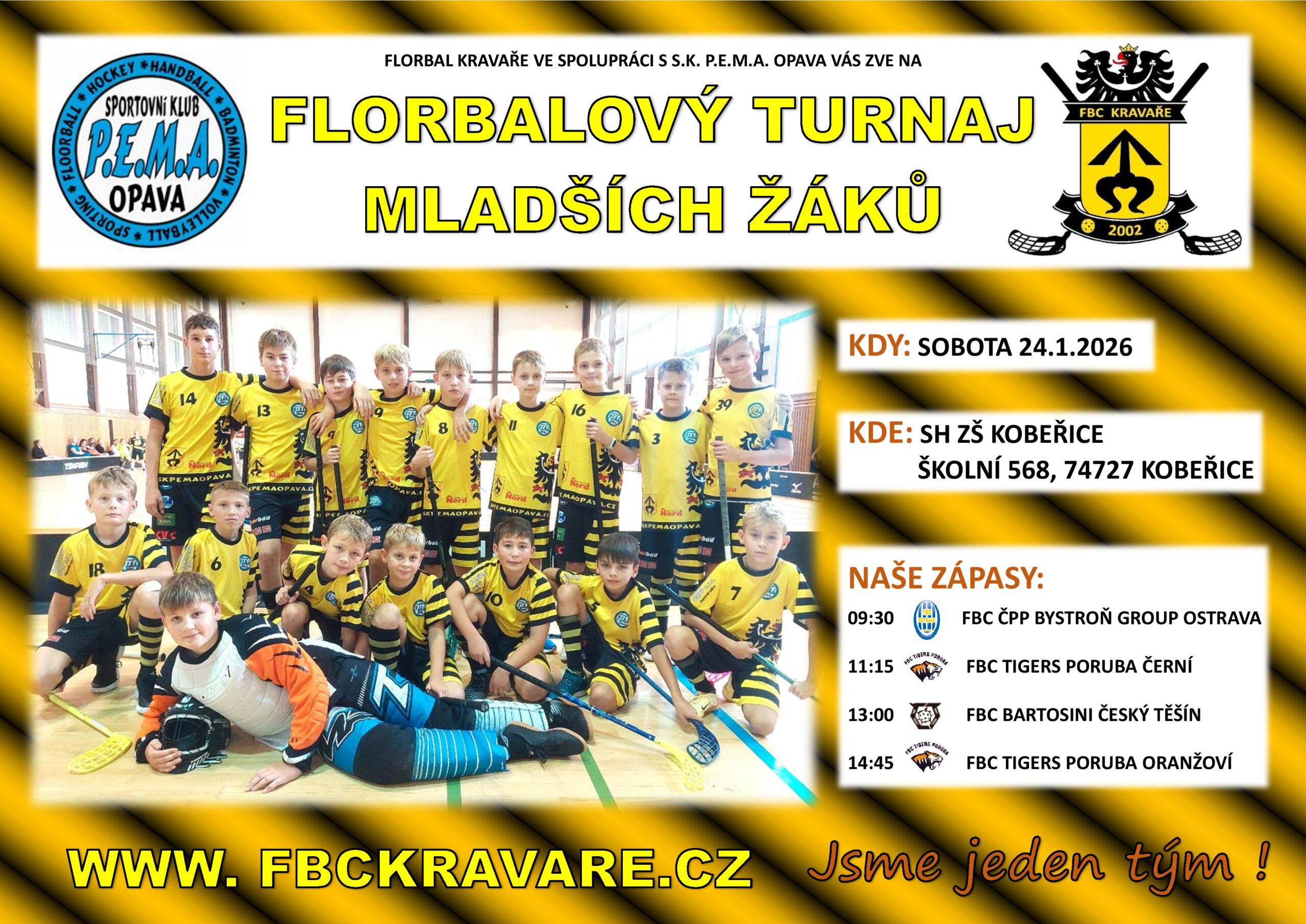 Tým  mladších žáků odehrál včera v Kobeřicích svůj domácí turnaj. Postupně narazili na čtyři soupeře. Dva zápasy se nám podařilo vyhrát a dva jsme bohužel prohráli. Výkon našeho týmu v některých zápasech nebyl moc dobrý. Vázla kombinace, střelba a především bojovnost. Kluci si to ale vynahradili v posledním zápase, který byl přímým soubojem o stupně vítězů. Tým v tomto zápase podal nejlepší výkon, kluci makali naplno, zlepšili se ve všech herních činnostech a zápas vyhráli. Na domácím turnaji tak vybojovali krásné 3.místo.